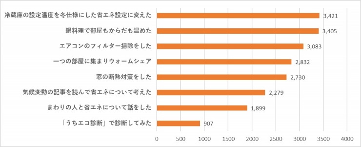 アクションは、特設サイトでのクリックが20,556件、専用フォームでの投稿が1,324件で、総数21,880件となりました。クリックによる省エネの取り組みでは、冷蔵庫の設定温度の変更や鍋料理の回数を増やすなど、台所で気軽に取り入れやすい活動に参加する方が多く見られました。