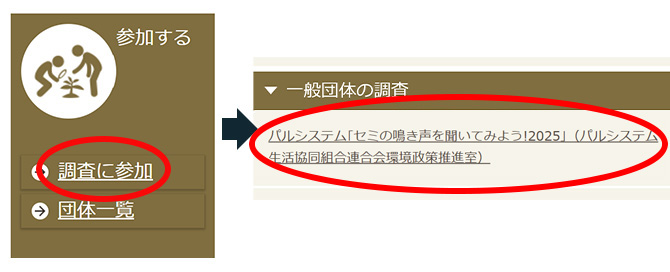 「参加する」>「調査に参加」より調査名パルシステム「セミの鳴き声を聞いてみよう!2025」(パルシステム生活協同組合連合会環境政策推進室)を選択してください。