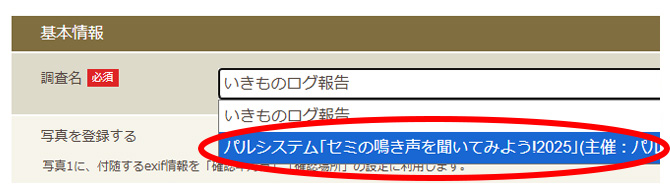 「報告する」>「個別報告する」を選択してください。調査名をパルシステム「セミの鳴き声を聞いてみよう!2025」(主催:パルシステム生活協同組合連合会環境政策推進室)にして、調査内容を入力してください。