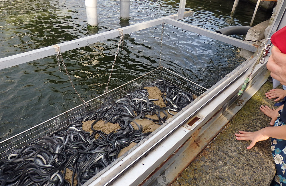 加工前のうなぎは1日エサを断ち流水にさらししっかりくさみを抜きます。加工場では白焼き、たれつけ、ふっくら焼きあがるようすを見学。加工前のうなぎに触れることもできます。