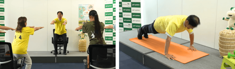 後半では、自宅や通勤・勤務中などでもできる簡単な筋トレを実演しました。かかと上げ、椅子に座ったままのウォーキング・股関節閉め・脚クロス・腹筋運動、正しいスクワット、そして負荷を変えられる腕立て伏せの方法など、日常的に取り入れられるのにしっかりと筋肉に効く「おサボリ筋トレ」の基本とコツを伝授いただきました。