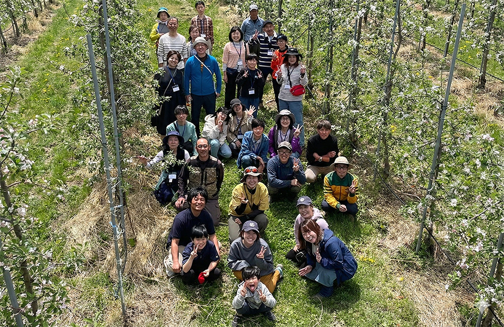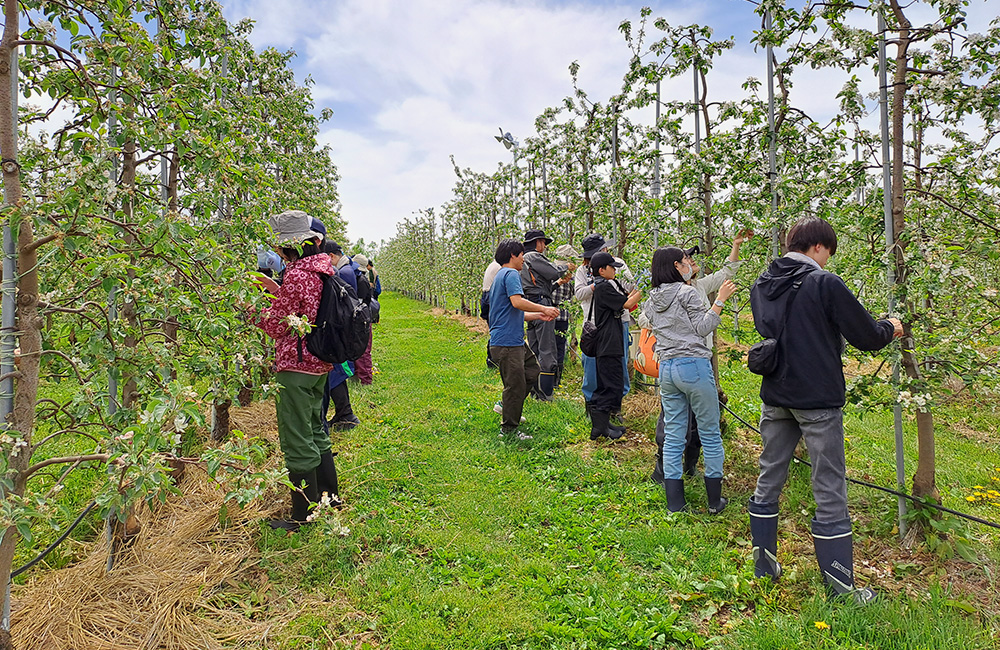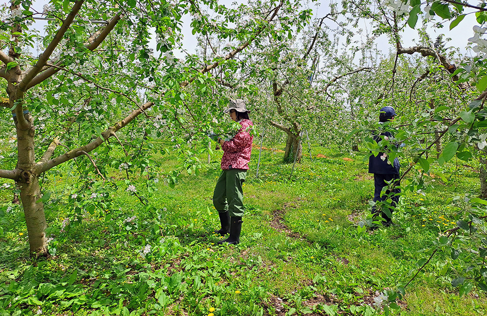今回のツアーでは、みなさんにりんごの摘果、摘花作業のお手伝いをしていただきます。おいしいりんごが実るための大切なこの作業、農家さんはひとつひとつ手作業でおこなっており、りんご栽培の中でももっとも時間のかかる作業です。みなさんのお手元に届くりんごがどのように作られているのか、安心安全な農作物が供給される過程を、農家さんに学びながらお手伝いしましょう。初めてでも大丈夫です!