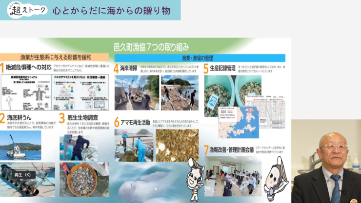 松本組合長からは、邑久町の海を次世代につなぐためのさまざまな活動が紹介されました。邑久町漁協は2019年に、牡蠣の「垂下式養殖」として日本で初めて、持続可能な漁業の証であるMSC国際認証を取得しています。絶滅危惧種のスナメリクジラが安心して子育てに訪れるほど豊かな海を守っていることがMSC国際認証取得にもつながりました。
