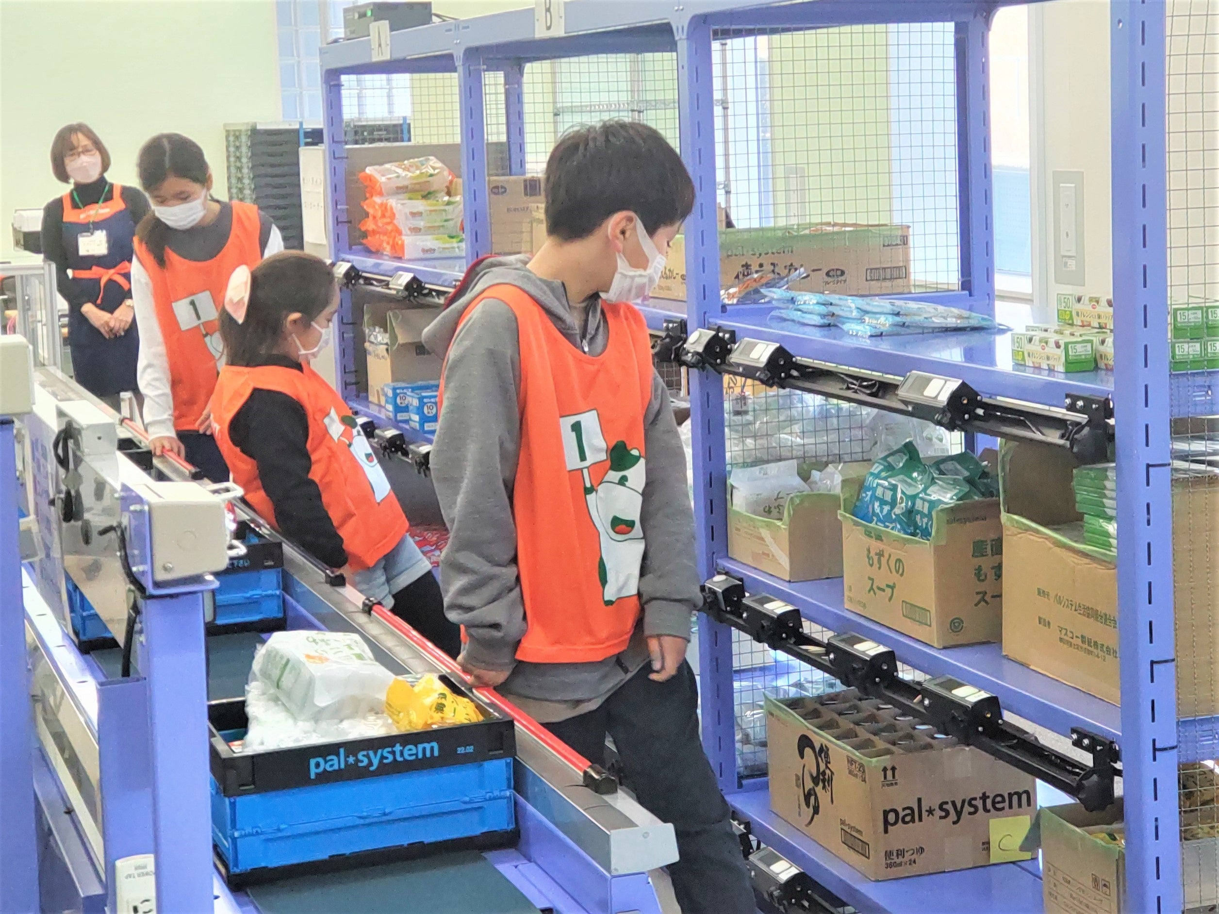 パルシステムの物流センターで使用している実物の物流機材を再現。パルシステムの商品を仕分けします。