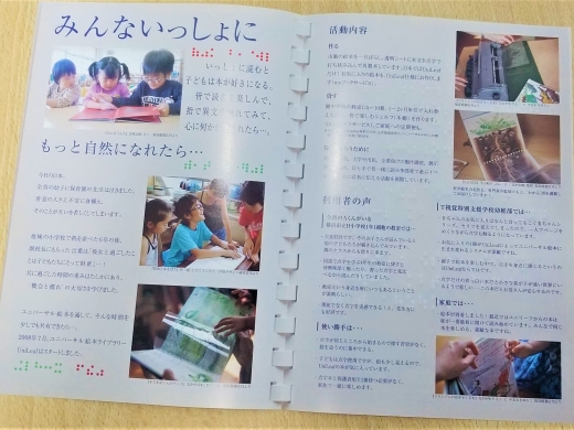 体験で使用したユニバーサル絵本は、市販の絵本を解体して物語を点字で打ち込んだ透明シートを挟んで再製本しています。見える人と見えない人が同じ本を一緒に楽しみ、お互いの世界を理解し合えるよう、全国の30を超える教育機関や個人に貸し出しています。