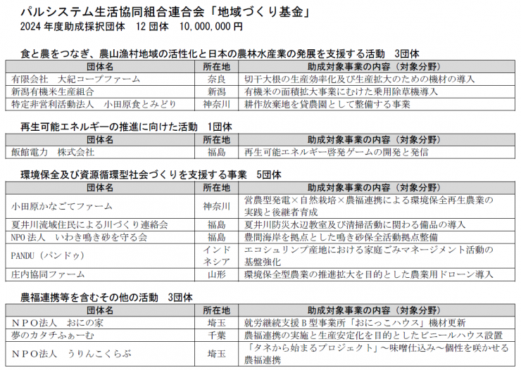 「地域づくり基金」運営委員会(委員長:大平真紀子・パルシステム群馬理事長)は、以下の分野を助成対象とし、パルシステムと関連がある団体から助成申請を募集します。