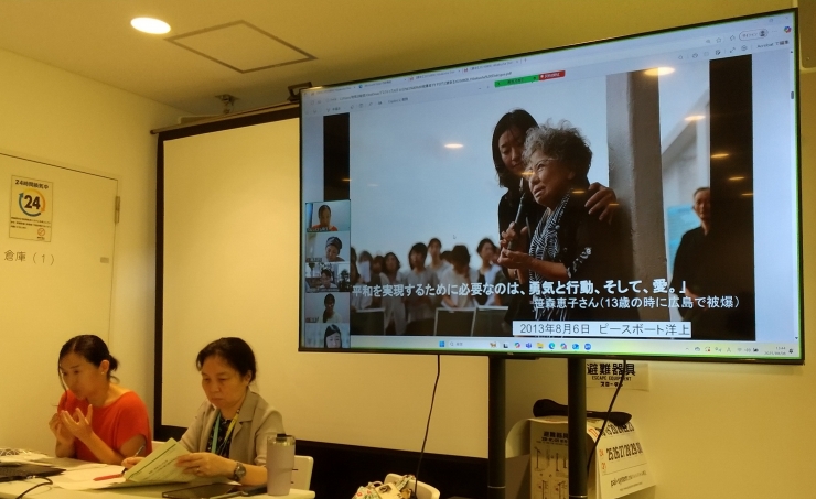 イベントを進行してくれたのは、公益社団法人ピースボート災害支援センター(PBV、本部:東京都新宿区、山本隆代表理事)の古賀早織さんです。古賀さんは、国際NGOピースボートが主催し、世界で被爆の実相を伝え、核廃絶を訴える「おりづるプロジェクト」の事務局として坂下さんとともにピースボートに乗船しました。「被爆証言のつらい体験を聞き、思いを受け止めるには準備が必要です。これから皆さんの心にまく平和への願いの種が芽を出すよう、耕す時間にしたいです」と、話し始めました。