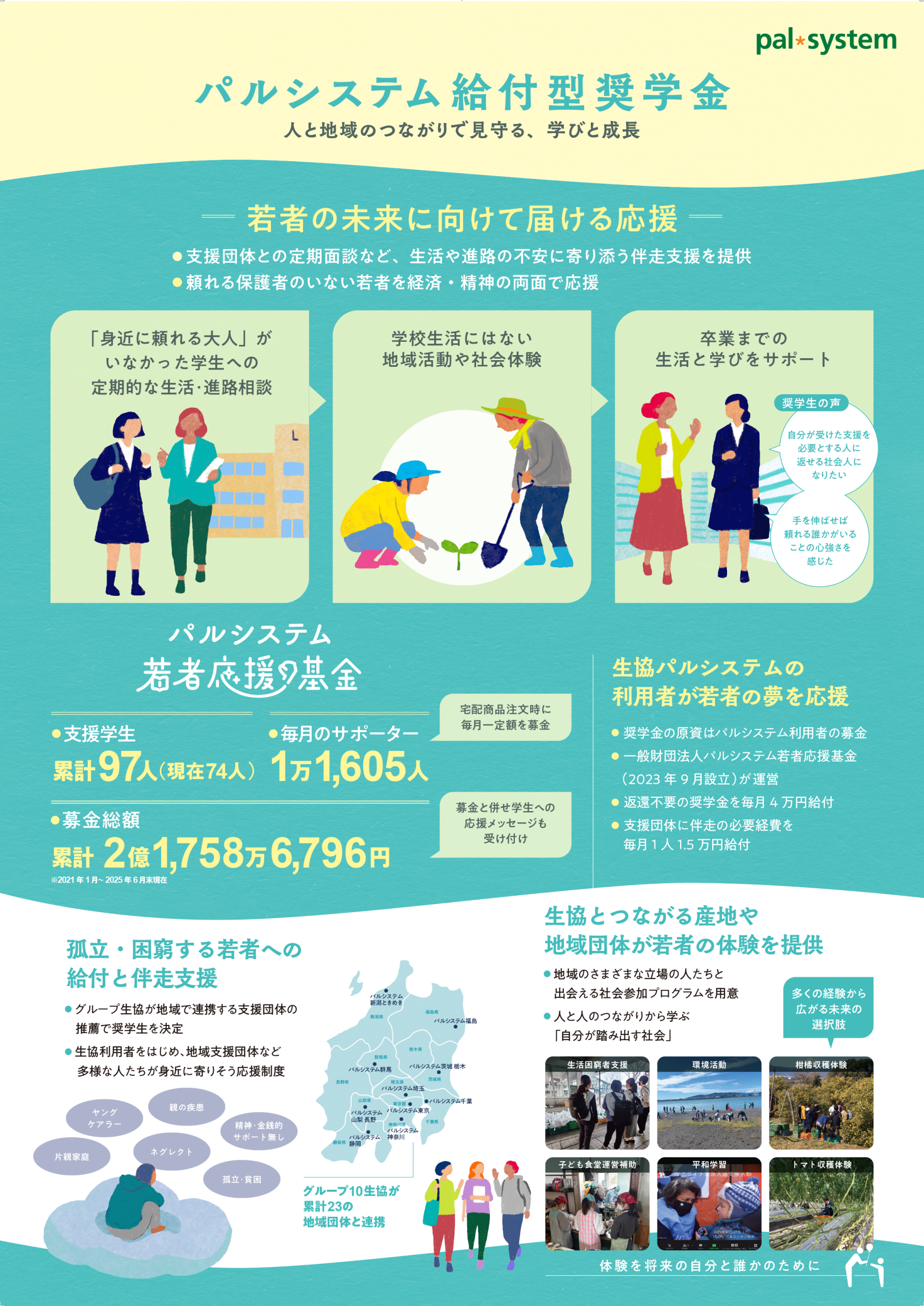 パルシステム生活協同組合連合会(本部:新宿区大久保、理事長:渋澤温之)の『パルシステム給付型奨学金』がこのたび、2025年度グッドデザイン賞(主催:公益財団法人日本デザイン振興会)を受賞しました。生活相談などを通じた学生に寄り添う伴走型支援や社会体験プログラムなどの仕組みが評価されました。