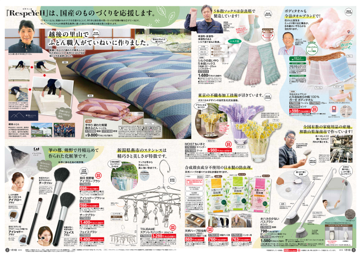 カタログ誌面では、生産現場を取材し、国産メーカーの職人の技や文化、作り手のもの作りへの思いを利用者に伝えます。作り手が利用者の声を聞きながら共に開発した商品なども紹介し、お互いの思いをつなぎます。季節を楽しむ商品から長く愛用できる定番品まで、幅広い品揃えで利用者の暮らしをサポートします。