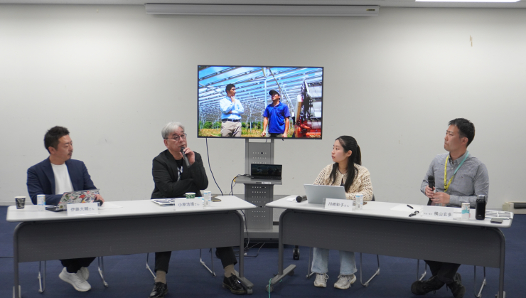 ゲストには、ソーラーシェアリング(営農型太陽光発電)を福島で実践する株式会社ジェイラップの伊藤大輔代表取締役と、ドキュメンタリー映画『陽なたのファーマーズ フクシマと希望』の監督を務めた小原浩靖さん、原子力に頼らない社会の実現を呼びかける認定NPO法人原子力資料情報室(東京都中野区、松久保肇事務局長)の川﨑彩子さんが登壇しました。それぞれの立場からソーラーシェアリングの可能性やエネルギー問題に対してできることを話し合いました。