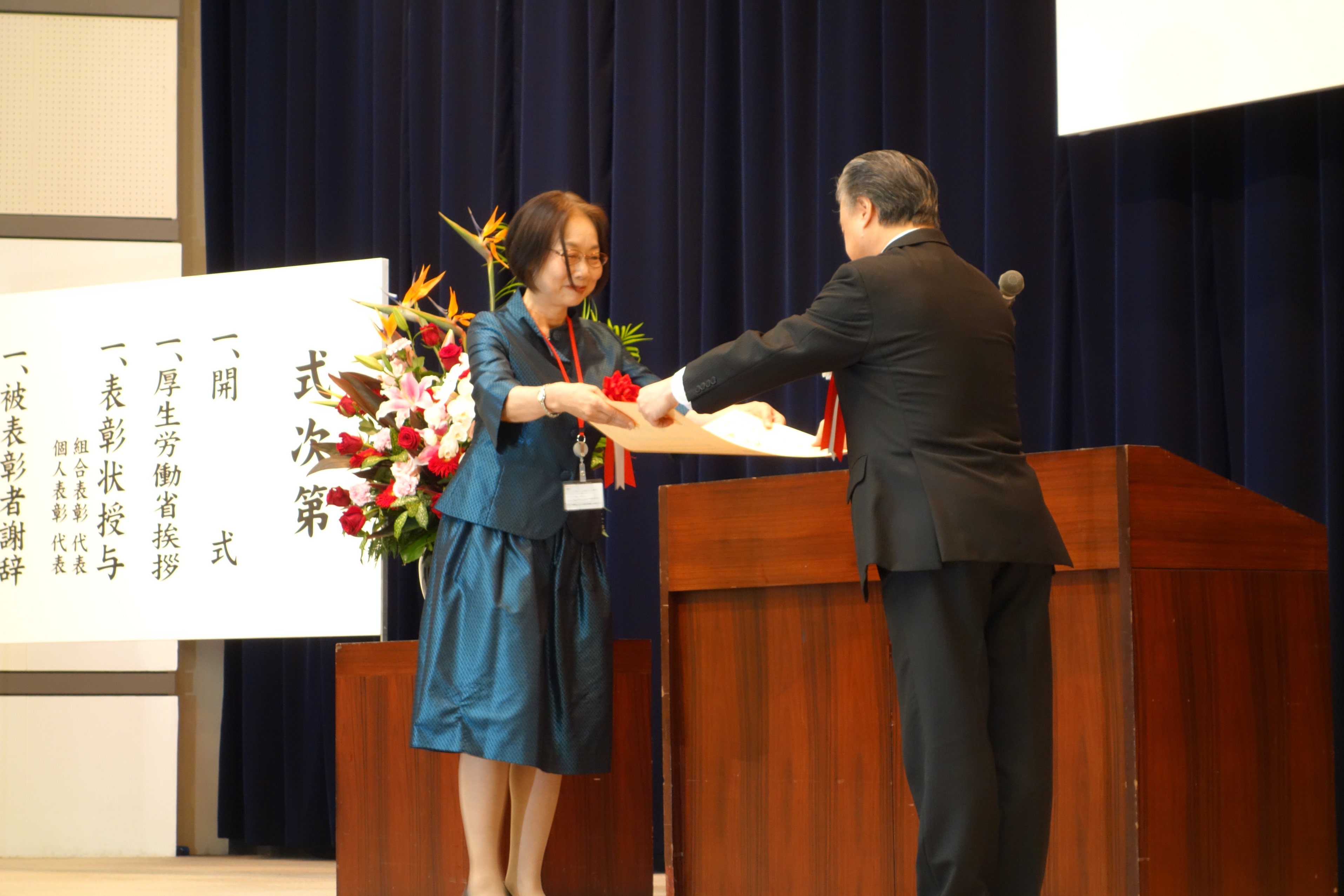 表彰式は10月30日(火)、東京・千代田区の厚生労働省で開催され、佐々木博子・パルシステム千葉理事長、田原けい子・パルシステム埼玉理事長、野々山理恵子・パルシステム連合会副理事長(パルシステム東京理事長)が出席しました。表彰式授与では、田原理事長が受賞者の代表として壇上へ上り、鈴木俊彦事務次官から表彰状と記念品が手渡されました。