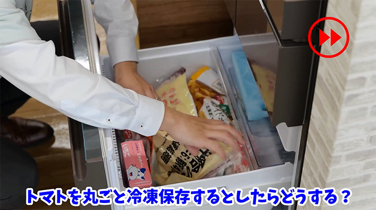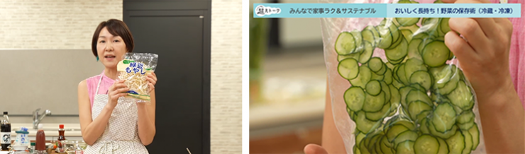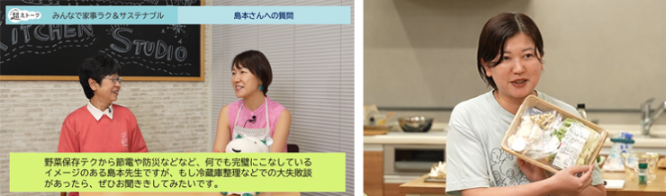 さまざまな物価高騰がくらしに影響を与える中、「節約やエコにつながるアイデアを知りたい!」との声に応えて、家庭での食品ロス率1位の「野菜」に着目。島本さんから野菜ごとの特徴を踏まえた冷蔵・冷凍の保存テクを紹介いただきました。保管中も成長を止めない小松菜やレタスなどの野菜は、畑での姿勢に近づけたり、生長点を断ったりするひと工夫で、新鮮さを失わずに保存することができます。トマトとミニトマトの冷凍方法の紹介では、実際に冷凍した野菜を使ったレシピの実演も行いました。