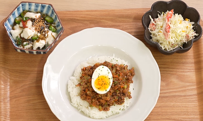 左上から時計回りに、「豆腐とオクラの彩り梅もずく酢」「混ぜるだけコールスローサラダ」「野菜の皮でレンチンドライカレー」
