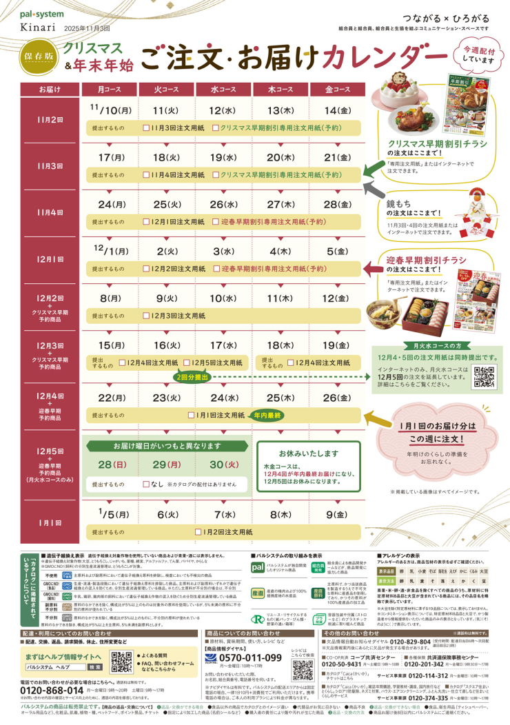 【11月3回】カタログ裏表紙~「コトコト」「Kinari」クリスマス&年末年始 ご注文・お届けカレンダー