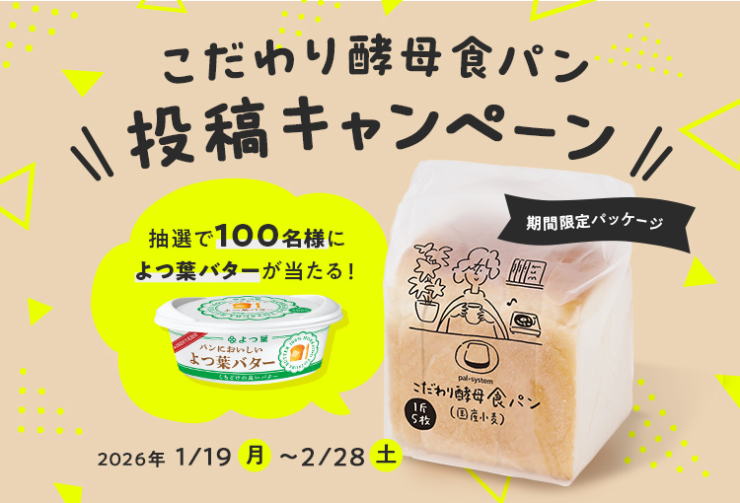 さらに!期間限定パッケージでの販売を記念して「こだわり酵母食パン投稿キャンペーン」を実施します。参加者の中から抽選で100名様に『パンにおいしいよつ葉バター 100g』をプレゼント。食卓シーンやアレンジなど、「こだわり酵母食パン」に関する投稿であれば何でもOK!ご応募お待ちしています♪