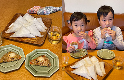子どもの日には何を作ってお祝いしようかな? と毎年悩みますが、今年はこれに決定です。多めに作ったのでうずらの卵が足りなくなりましたが、子どもたちは「ぼくのは入っていた! アタリ~」と、大盛り上がり(笑)。三角形に包まれていることで、食べやすさも楽しさも◎です。