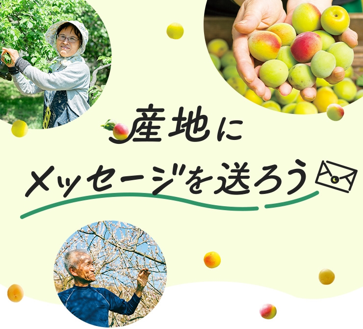 梅の栽培に励む産地・生産者に応援・感謝のメッセージを送りましょう。「いつもありがとう」、「応援しています」の声が産地のチカラになります。送ったメッセージは産地に届け、7月中旬ごろにお知らせページにてご紹介します。